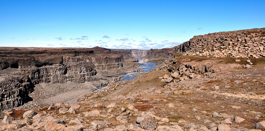 (13) Weiter geht's in Richtung Norden, unsere nächste Station ist der Dettifoss ein beeindruckender Wasserfall. Der Dettifoss wird vom Gletscherfluss Jökulsá á Fjöllum gespeist, der aus dem Vatnajökull fließt. Der Wasserfall stürzt 45 Meter in die Jökulsárgljúfur-Schlucht hinab. Die Schlucht liegt im nördlichen Teil des Vatnajökull-Nationalparks, wodurch der Dettifoss naturgeschützt ist. Die Umgebung des Dettifoss ist von einer kargen Vulkanlandschaft geprägt, die dem Wasserfall eine besonders raue und majestätische Atmosphäre verleiht.