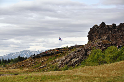 Am Lögberg, dem Gesetzesberg (Bild unten rechts), flattert die isländische Flagge mit ihren drei Farben – blau für das Meer und den Himmel, weiß für den Schnee und die Gletscher und rot für das Feuer der Vulkane. Dort verkündete der Gesetzessprecher oder der oberste Gode (Stammesführer) während der alten Tage die Gesetze.