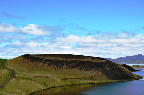 (17) Bei Skútustaðagígar finden sich eine Reihe von Pseudokratern am Mývatn-See. Ein Pseudokrater wird auch falscher Vulkan genannt. Seine Form ähnelt normalen Kratern, er verfügt jedoch nicht über ein Kraterrohr, das den Zugang zu einer darunter liegenden Magmakammer ermöglicht.